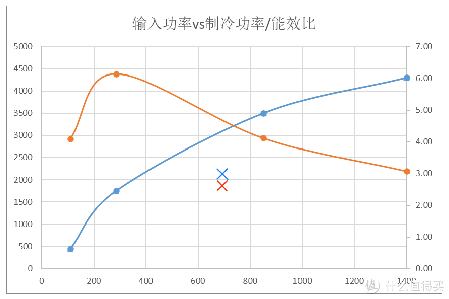 见下图,变频空调的压缩机转速可变,所以制冷(热)量跟制冷(热)功率、以及能效比是一组曲线:蓝线是制冷量随制冷功率的变化(左侧纵坐标)、橙色线是能效比随制冷功率的变化(右侧纵坐标)。而定频空调则是两个点:蓝色×是制冷量跟输入功率的关系;橙色×是能效比跟输入功率的关系。